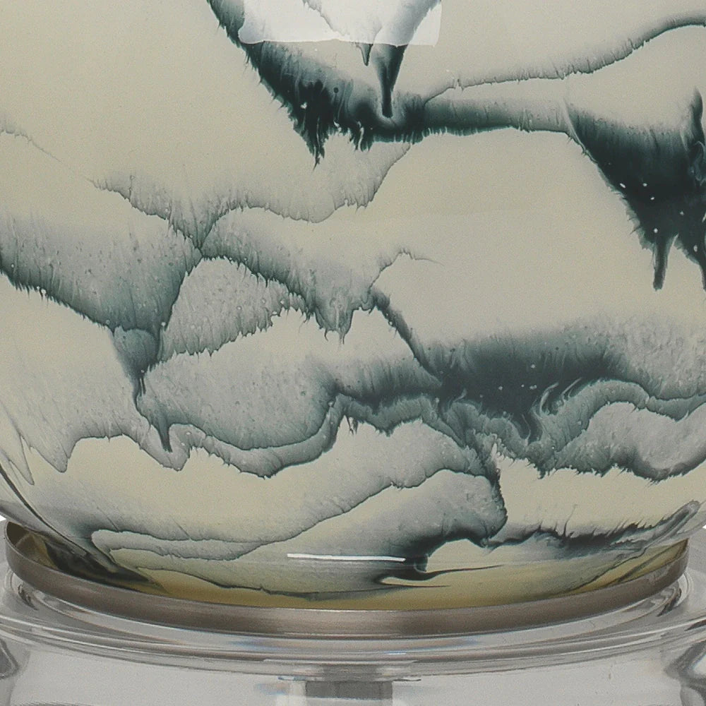 the Elodie double gourd table lamp has an artisan glaze in floating blue swirls on a creamy white body and silver base.