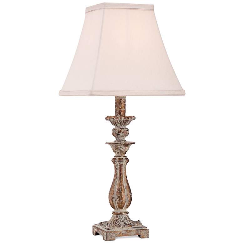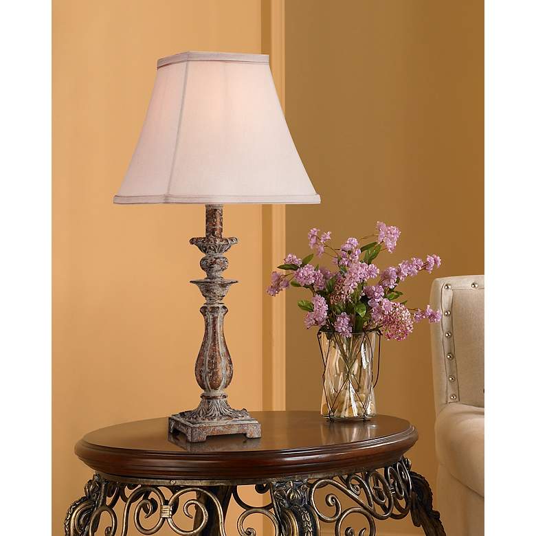 With a traditional candlestick base, it is only fitting that this accent table lamp would be as romantic as candlelight. It comes in a distressed antique gold finish that gives it an old-fashioned air of elegance. An off-white square lamp shade on top completes the classic look. From the Regency Hill brand, this table lamp is perfect for both traditional luxe and rustic farmhouse settings.