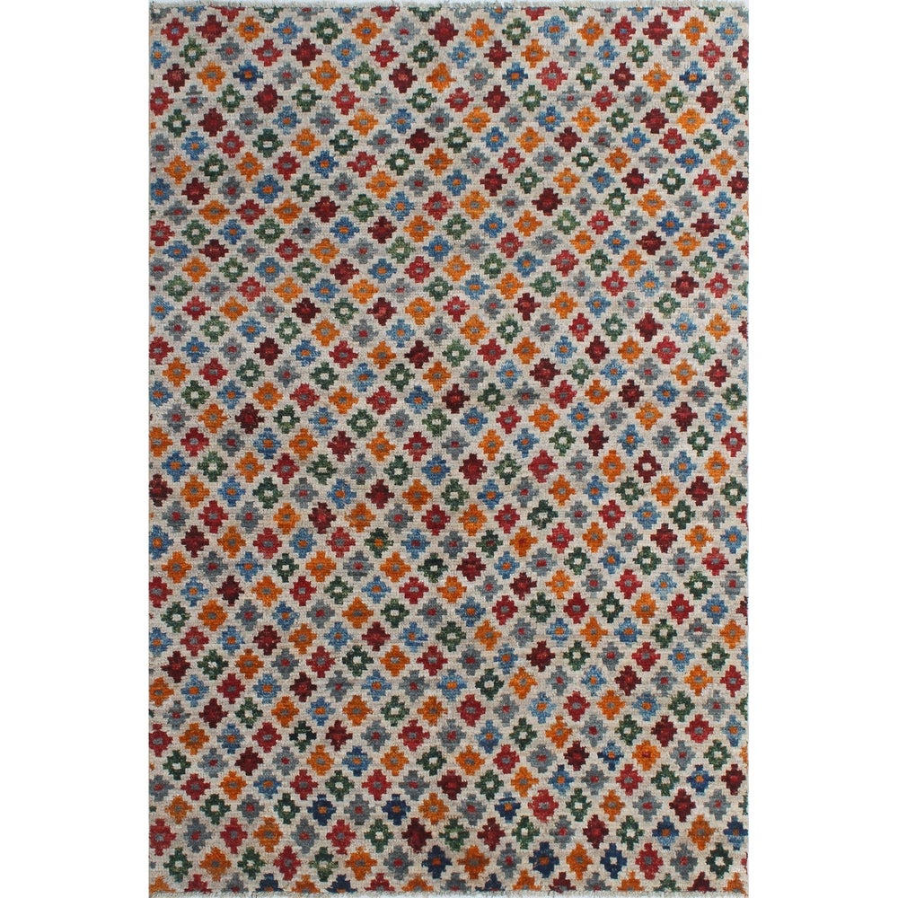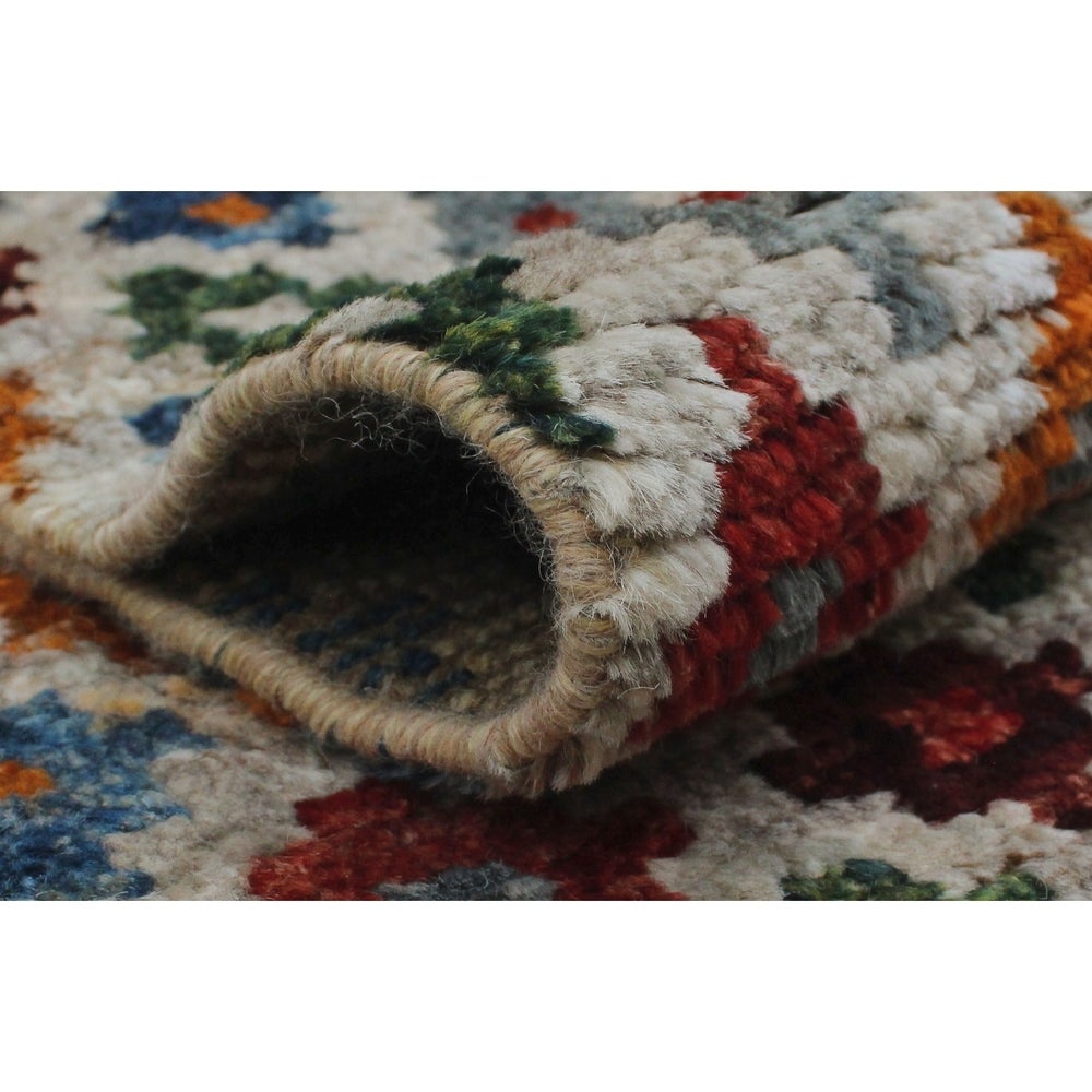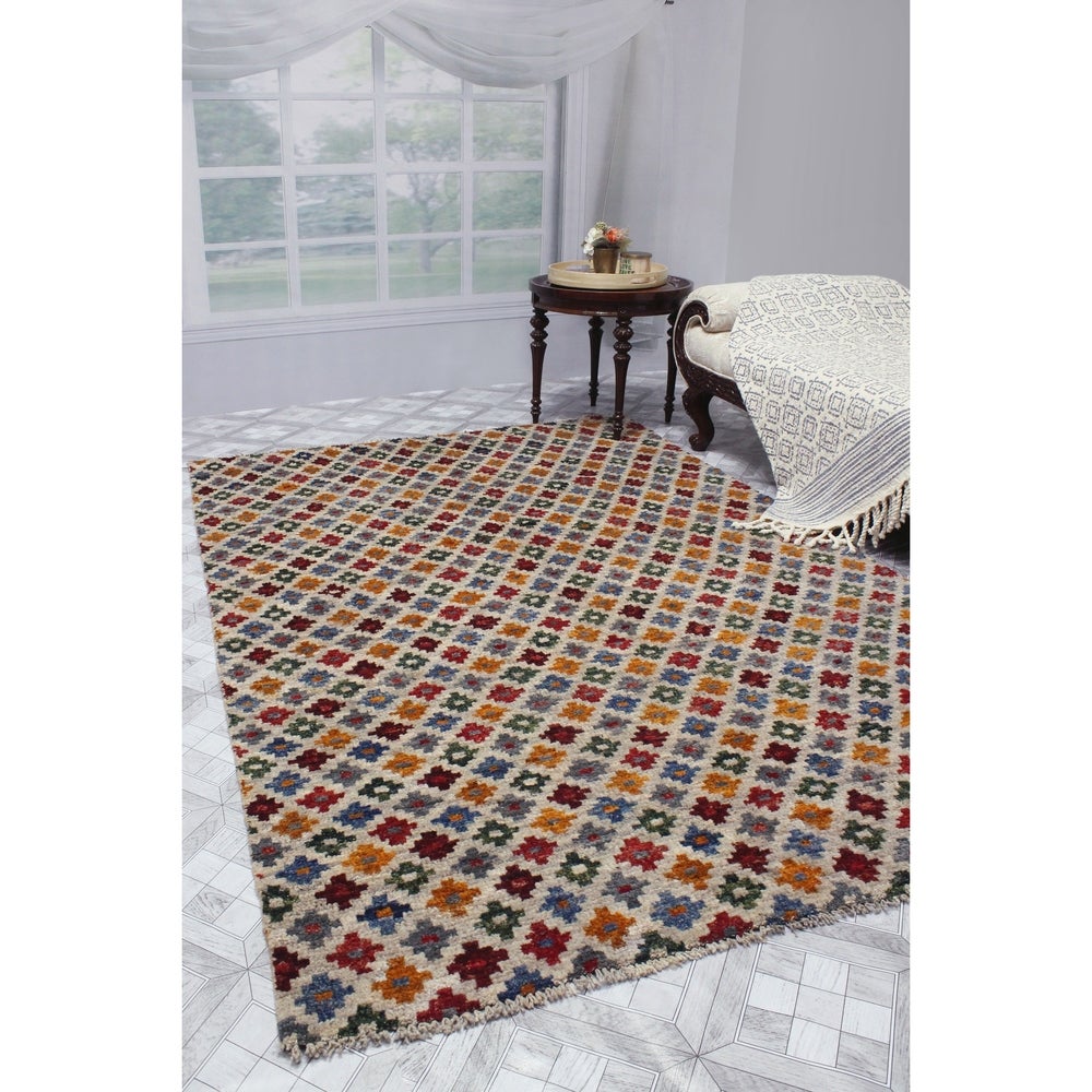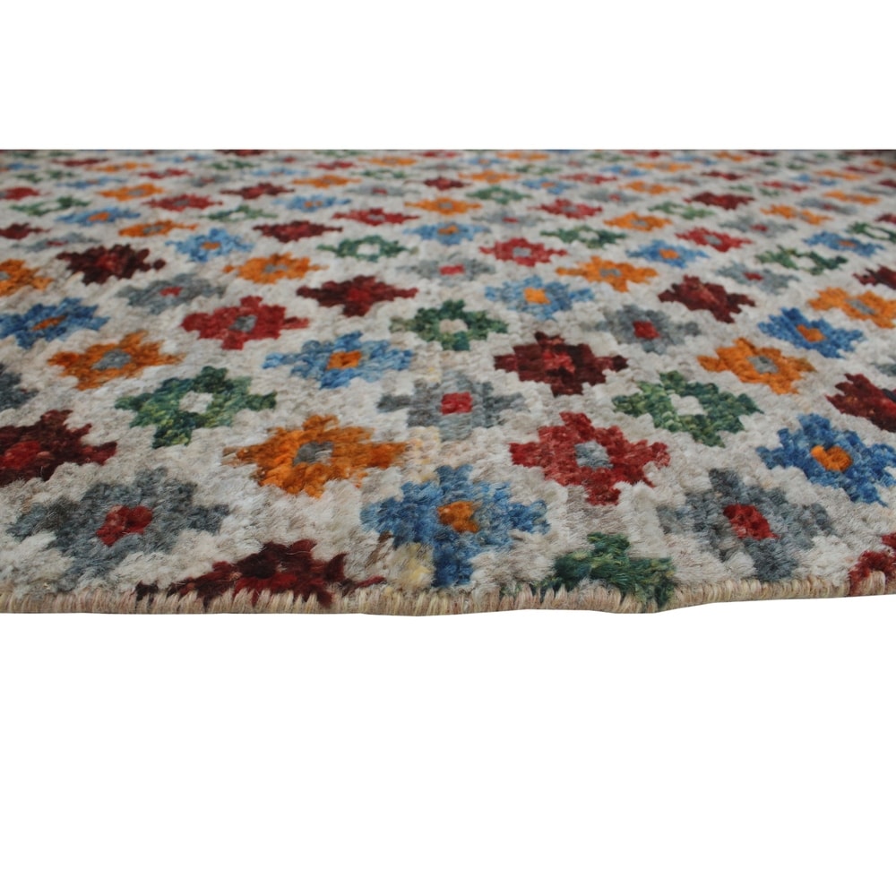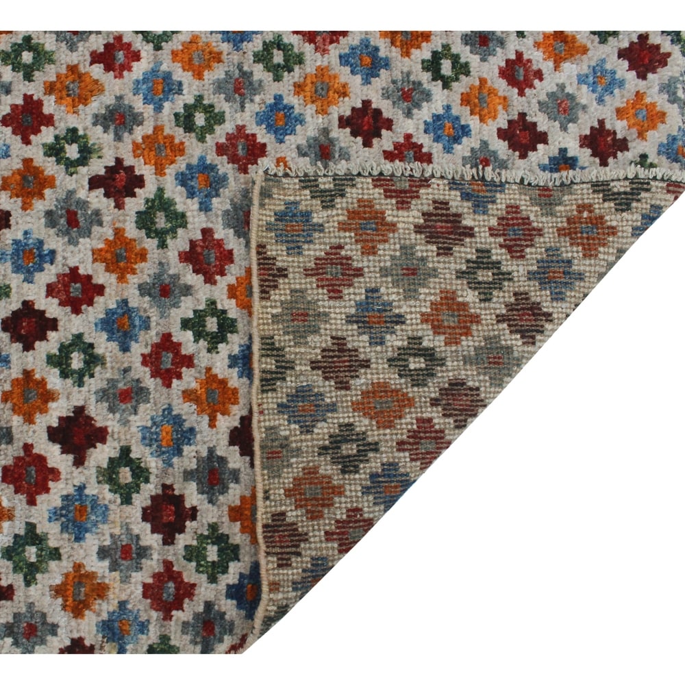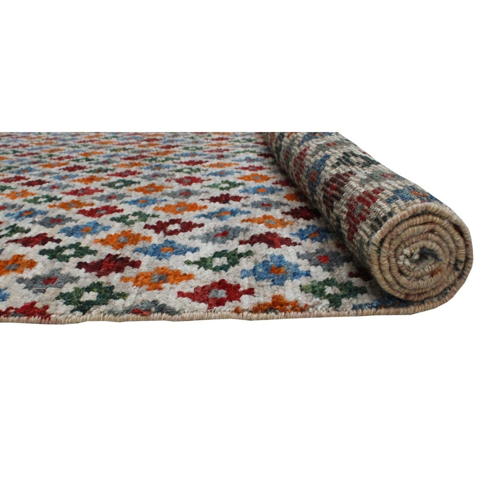This dynamic rug is hand knotted by skilled artisans using 100% wool. Multicolored hues complement any given space for a fresh update. Because of each rug's handmade nature, no two are exactly alike, and quantities are limited. Subtle signs of wear to give it a personal touch making it a true one-of-a-kind. Vacuum regularly to prevent dust and crumbs from settling into the roots of the fibers. Brushless attachment is recommended. Avoid direct and continuous exposure to sunlight. Use rug protectors under the legs of heavy furniture to avoid flattening piles. Do not pull loose ends, clip them with scissors. Turn carpet occasionally to equalize wear. Clean spills immediately; if liquid, blot with clean, undyed cloth by pressing firmly around the spill to absorb as much as possible. For hard to remove stains, professional rug cleaning is recommended. Store in a dry, well-ventilated area. Use of a rug pad is recommended.