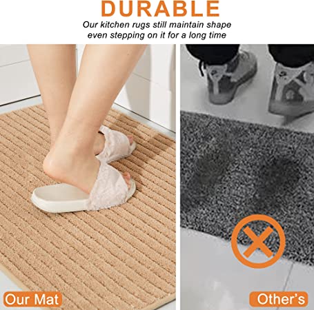 - Our kitchen sink rug is made of wear-resisting and softer Polyester fibers.Proper thickness of the kitchen carpet ensure that you are able to stand comfortably while working in the kitchen.The kitchen mat set also can reduce the noise and cover up cold tiles.Great water absorption & stain-resistant properties protect the floor from oil, dampness, sauces or food particles.