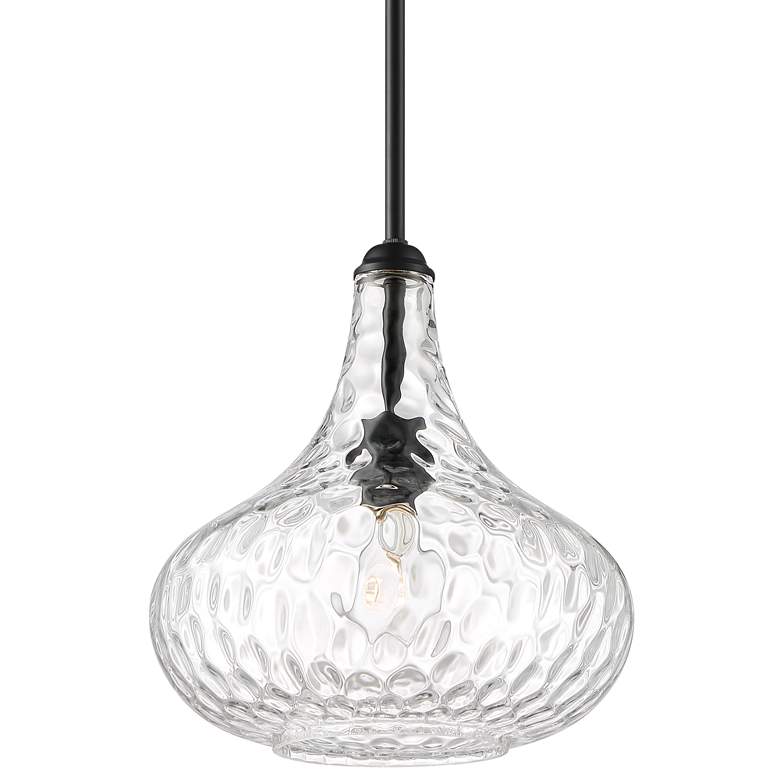 Curvy hammered glass draws all eyes to the exceptional illumination of this modern matte black mini pendant.