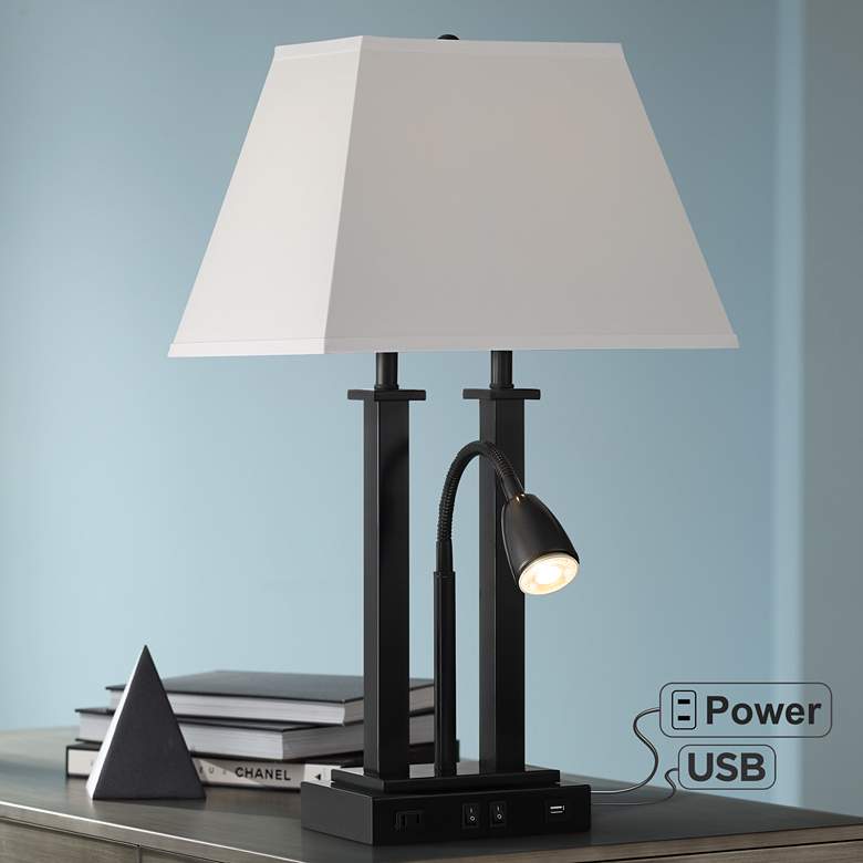 Perfect for office space or bedside, this functional desk lamp comes with an LED gooseneck reading light, power outlet and USB port.