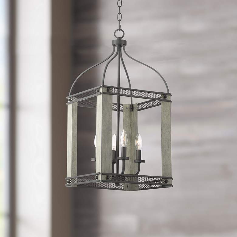 Wood and metal mesh accents cement the traditional farmhouse character of this four-light lantern pendant.