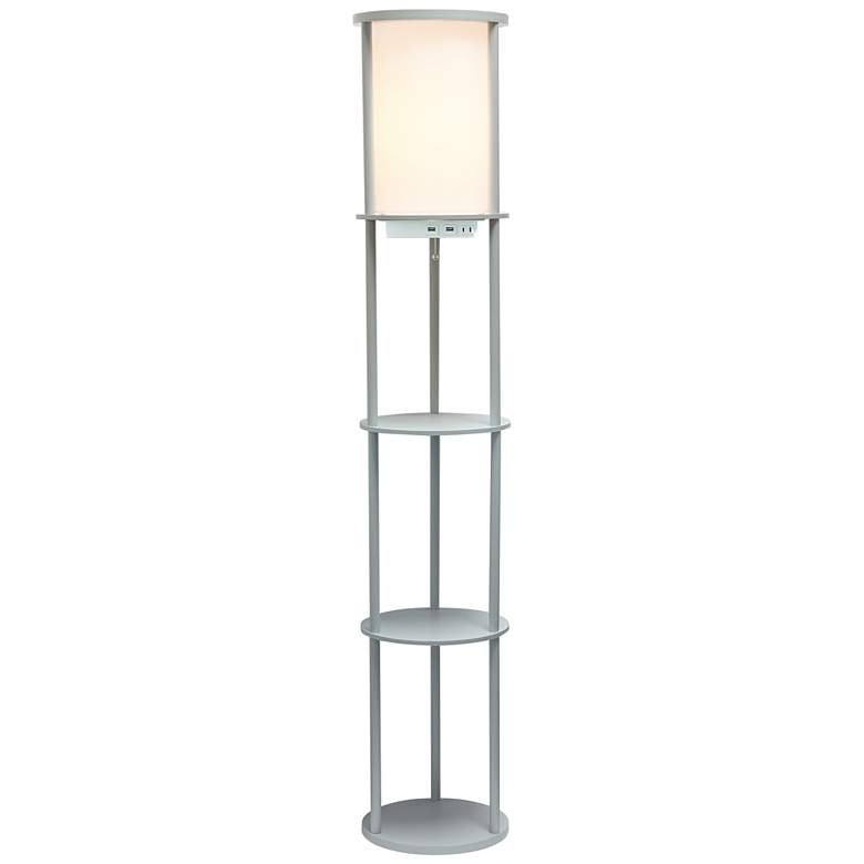 - Contemporary three-shelf etagere organizer storage floor lamp with USB ports and charging power outlet from the Kiva collection designed by All the Rages.