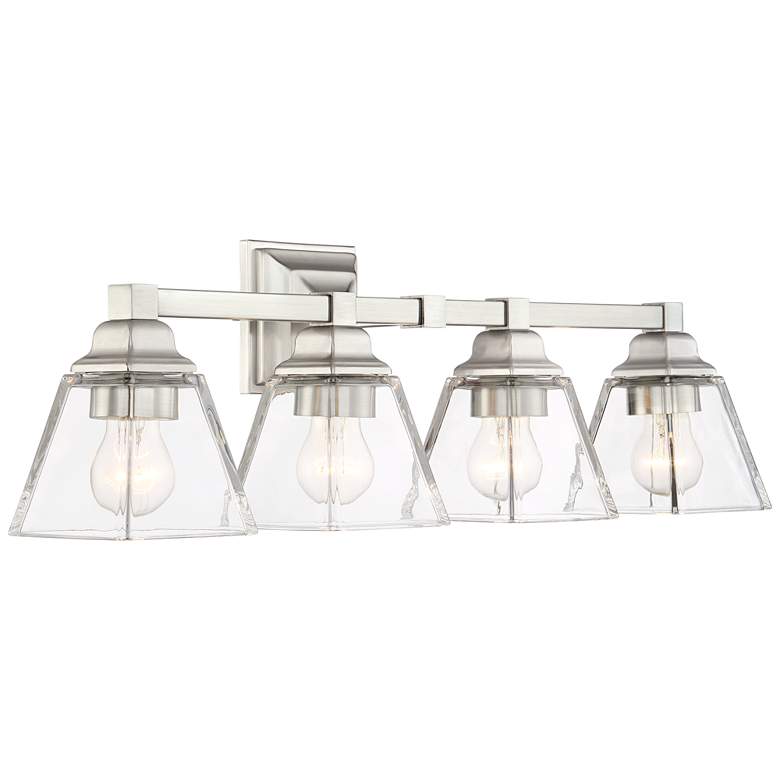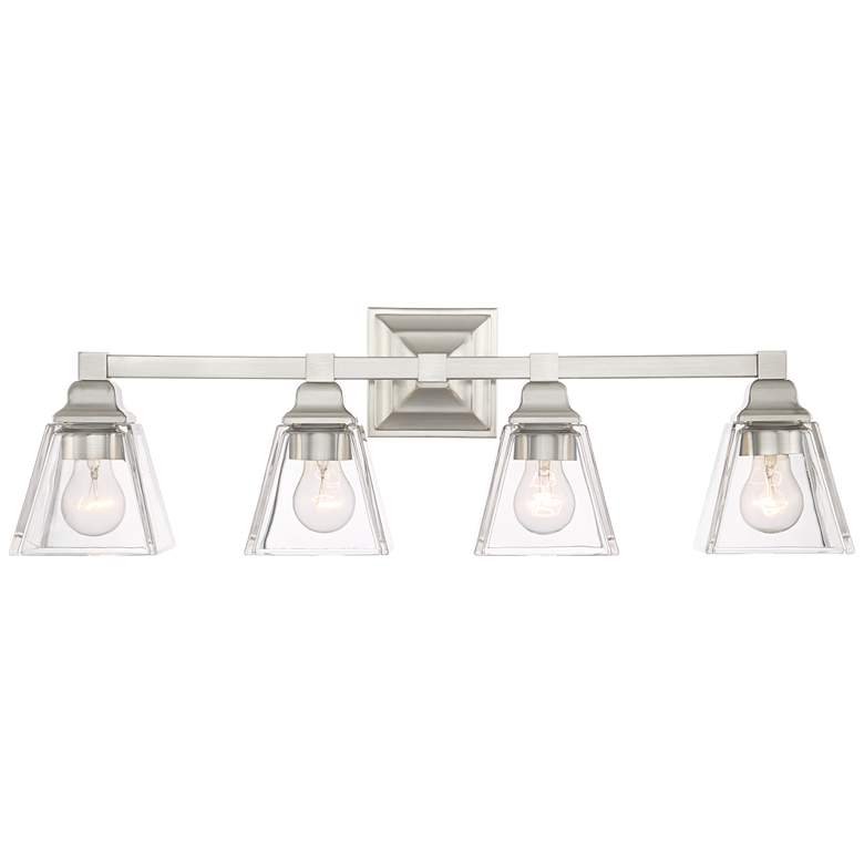 Illuminate your bathroom space with this satin nickel and clear glass four-bath light.