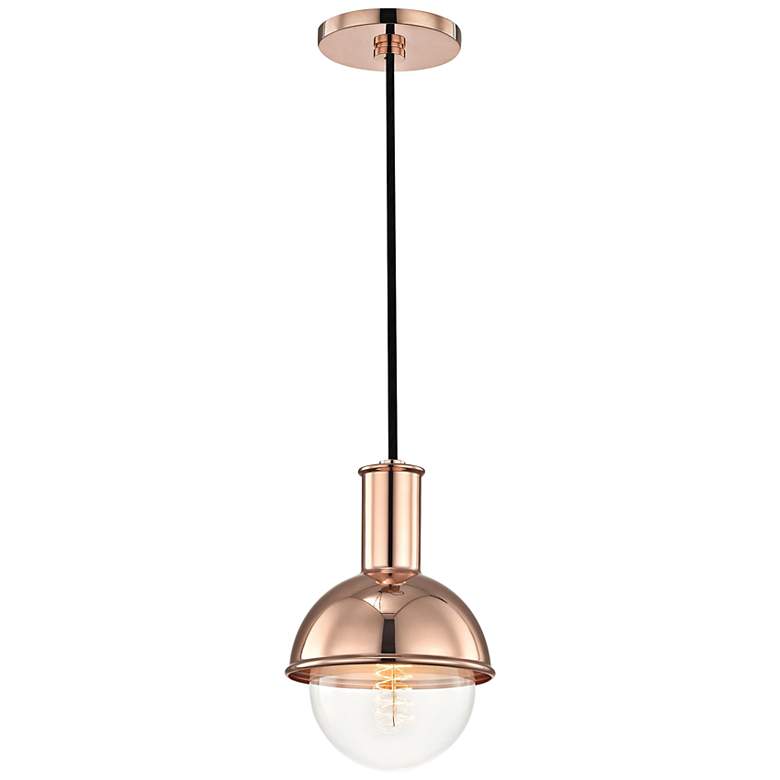 Eye-catching yet undeniably sleek, this by Hudson Valley is bound for a contemporary home. The Riley mini pendant from Mitzi collection is perfect mounted in a hallway or foyer, and features a polished copper finish. The domed silhouette accentuates its modern details with style and sophistication.