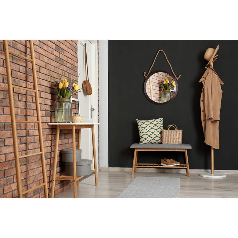 With a nautical motif, this round wall mirror features a black and brushed copper finish frame and a rope hanger.