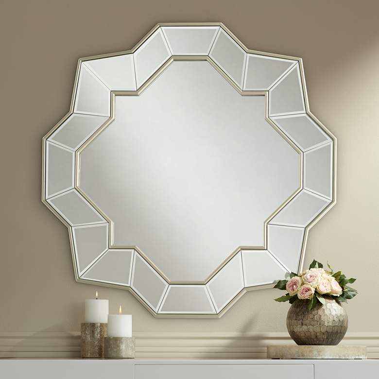 A contemporary wall mirror perfect for enhancing a bedroom space or makeup area. The Aurora mirror from Possini Euro Design is a work of art with modern sensibilities. The quarterfoil silhouette features a champagne finish and beveled glass for extra elegance.