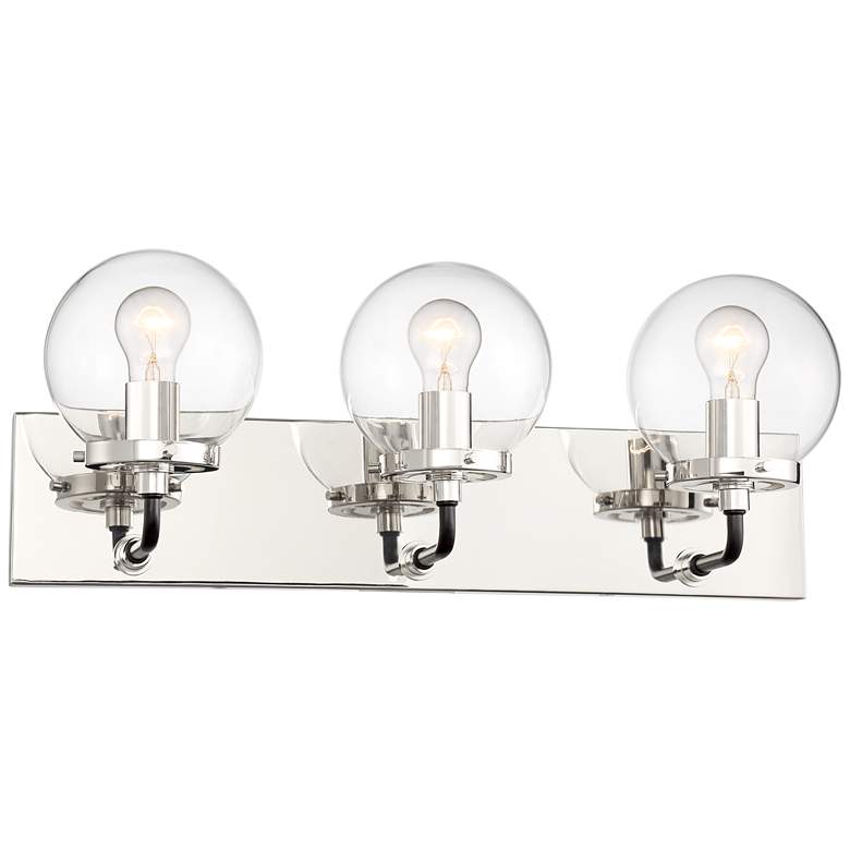 Create a modern and minimalist-inspired bathroom with this polished nickel bath light featuring three clear globes.