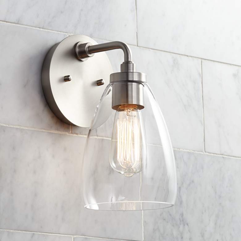 Featuring a brushed nickel finish, this contemporary single-light wall sconce will provide a shining look to a living room or hallway area. It has a rounded clear glass shade with an open bottom, giving a full view of whatever light bulb you choose to use. Perfect for an industrial or urban style setting.