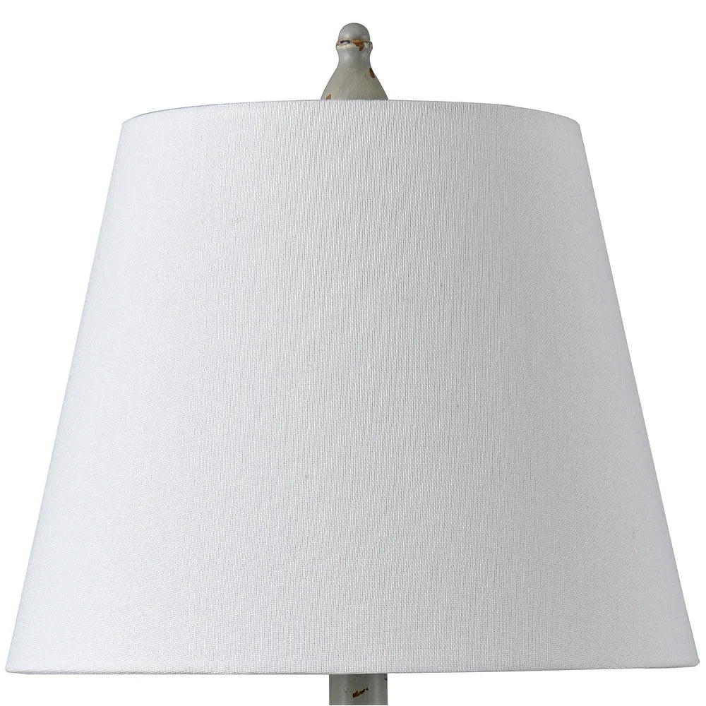 This table lamp comes in a distressed blue and green frame with a white shade; Requires one (1) 40-watt Incandescent E26 base bulb (not included).