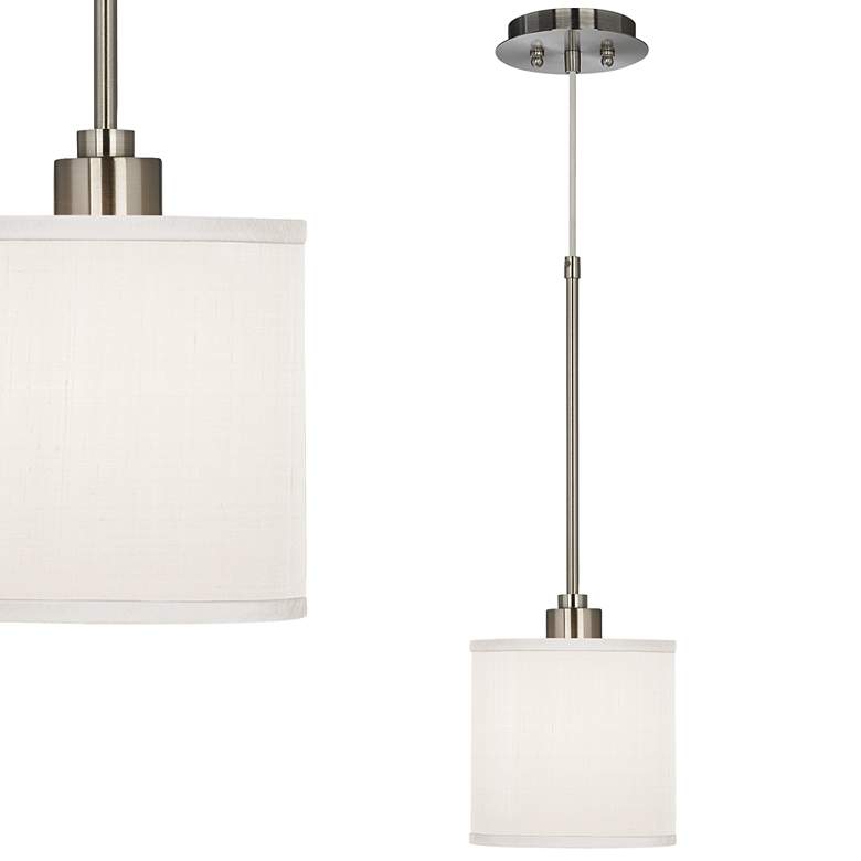 Grouped together or on its own, this brushed nickel mini pendant light with teal blue faux silk shade is a fresh, illuminating accent.