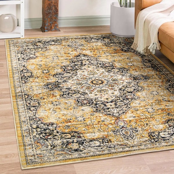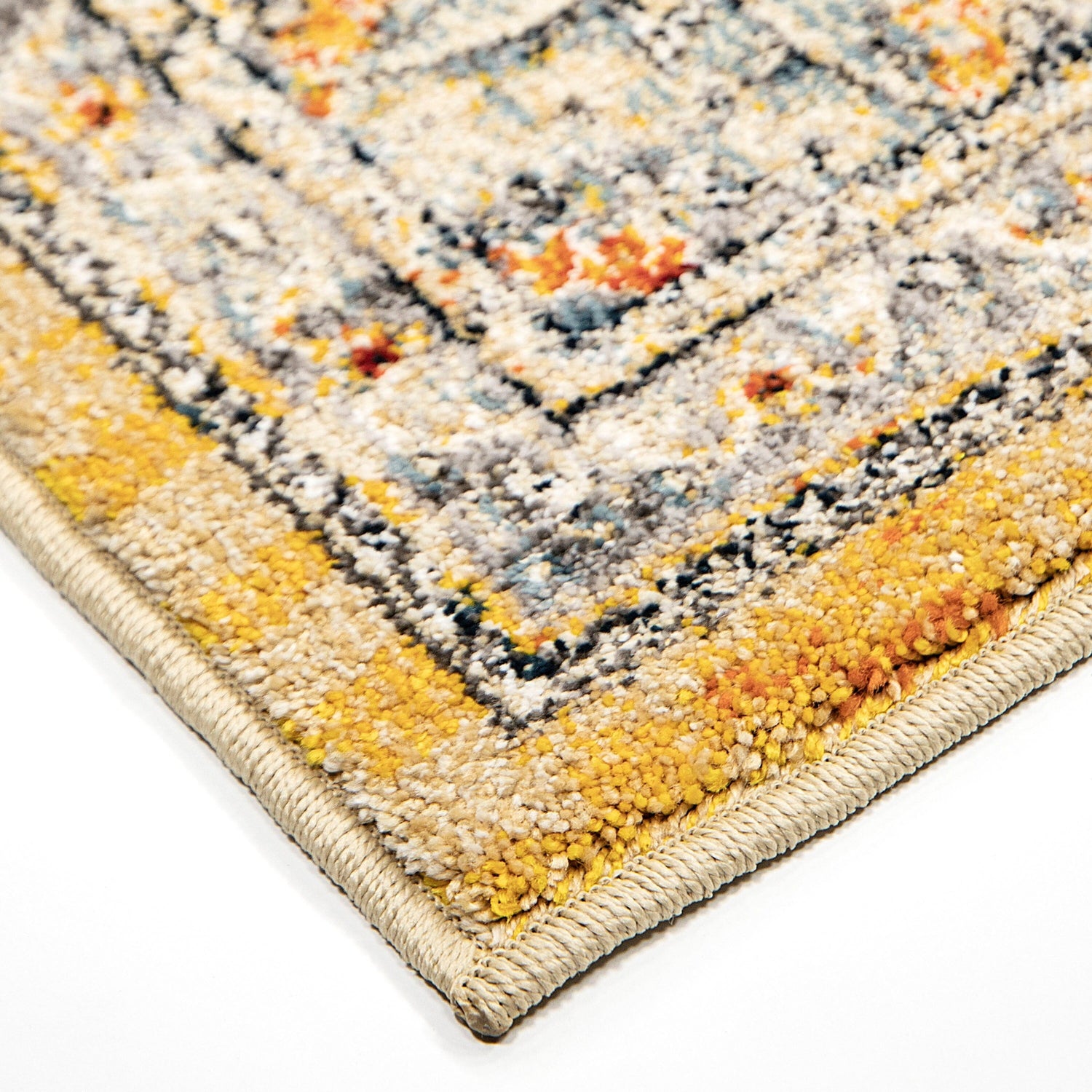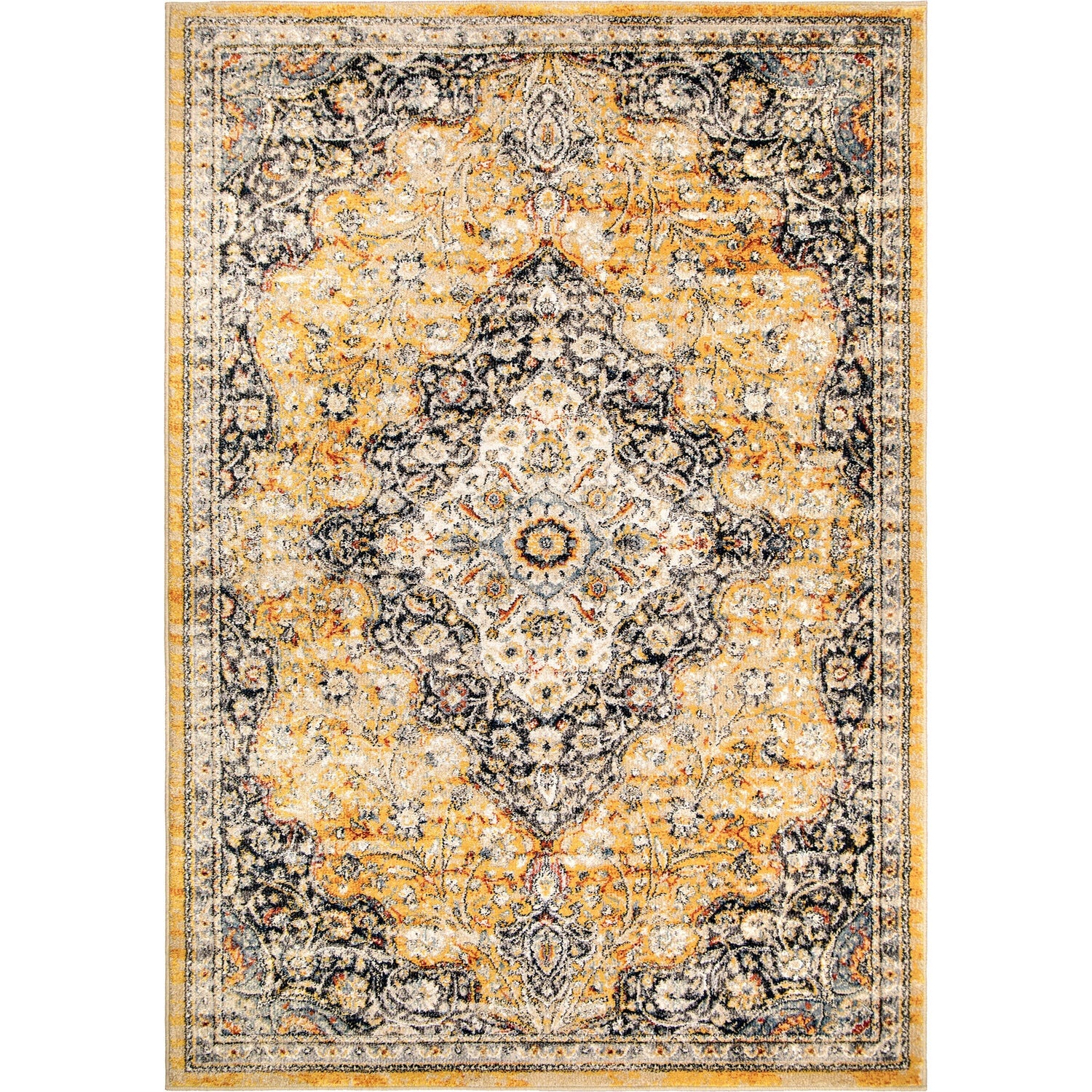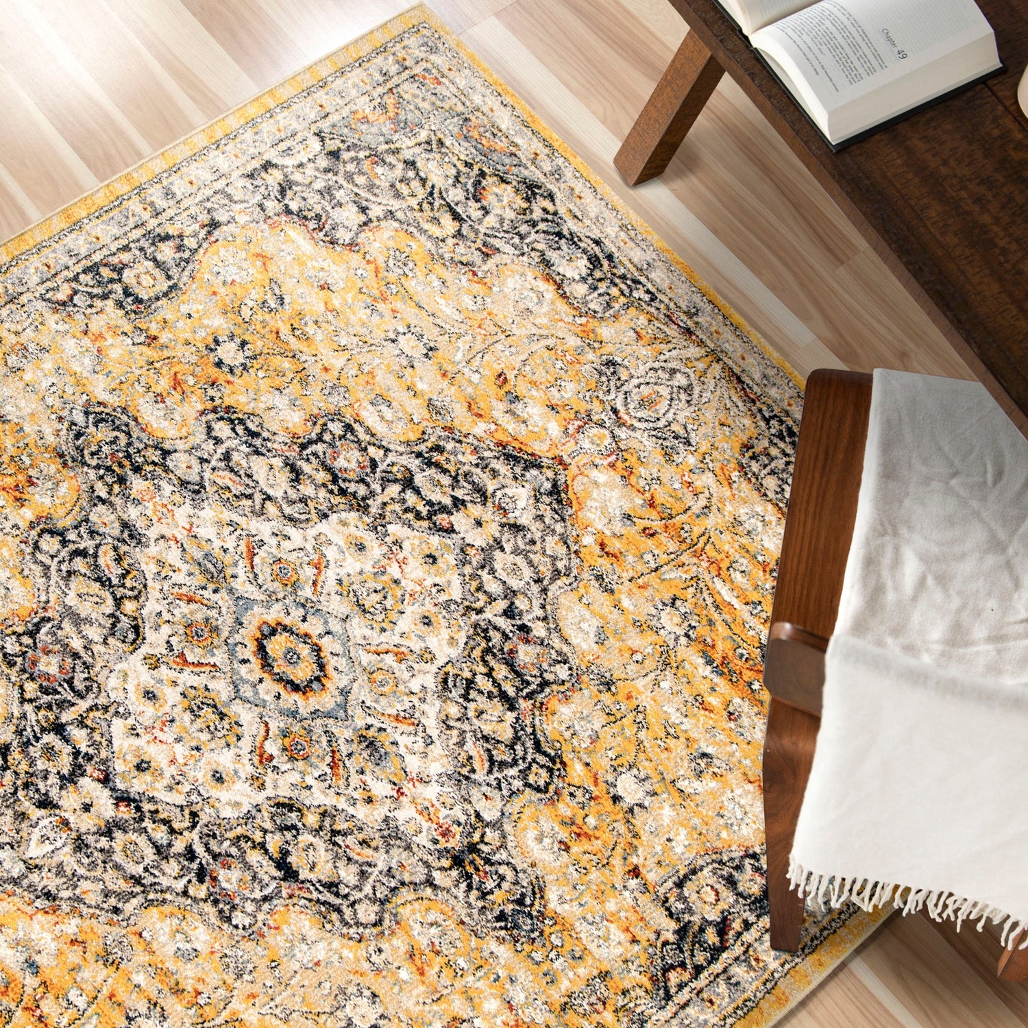 A beautiful and traditional piece that will add a touch of elegance to any room. The rug features a stunning yellow, ivory, grey, silver, and black color palette with a beautiful Persian design. It is made of stain resistant and fade resistant yarn for durability and easy care. The rug is also soft to the touch, making it comfortable for your feet. It is woven in the USA from high quality yarn for durability and long lasting beauty. A wonderful addition to any home, the Phelan Yellow Area Rug is sure to please.