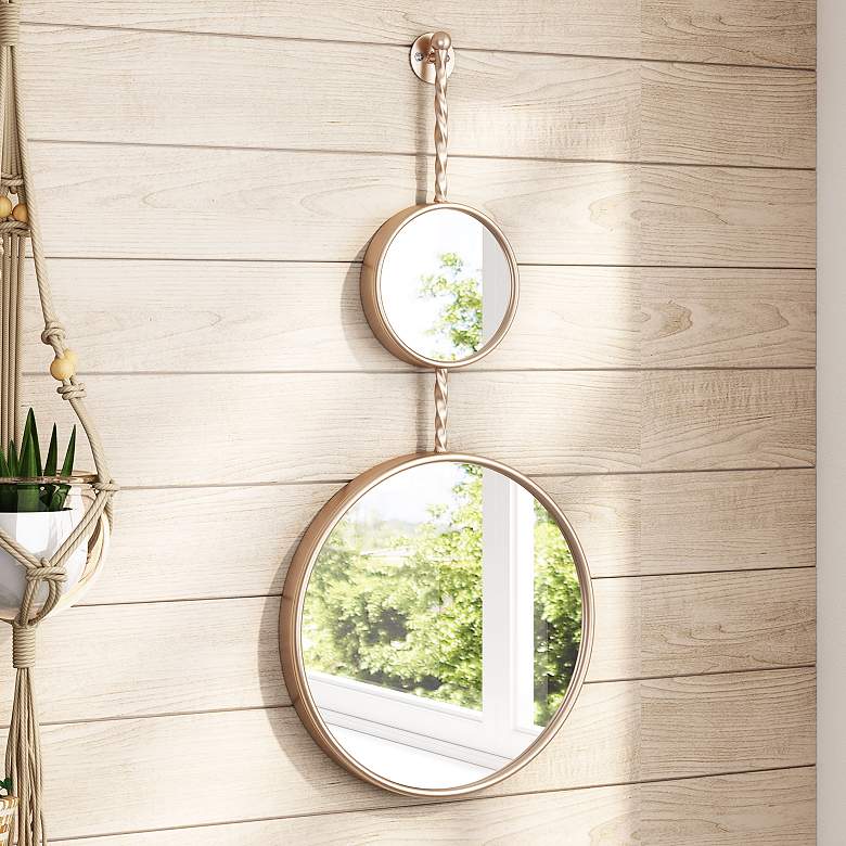 A timeless design shows versatility in this Mid-Century Modern decorative wall mirror from the Mott collection by Zuo Modern. With a hint of industrial flavor, it delivers a chic silhouette of circles featuring non-beveled glass mirrors surrounded by powder-coated gold finish frames. Choose this exquisite mirror for a functional update to a dressing space or bedroom, or place it in a main living area above a console to show off its elegance.